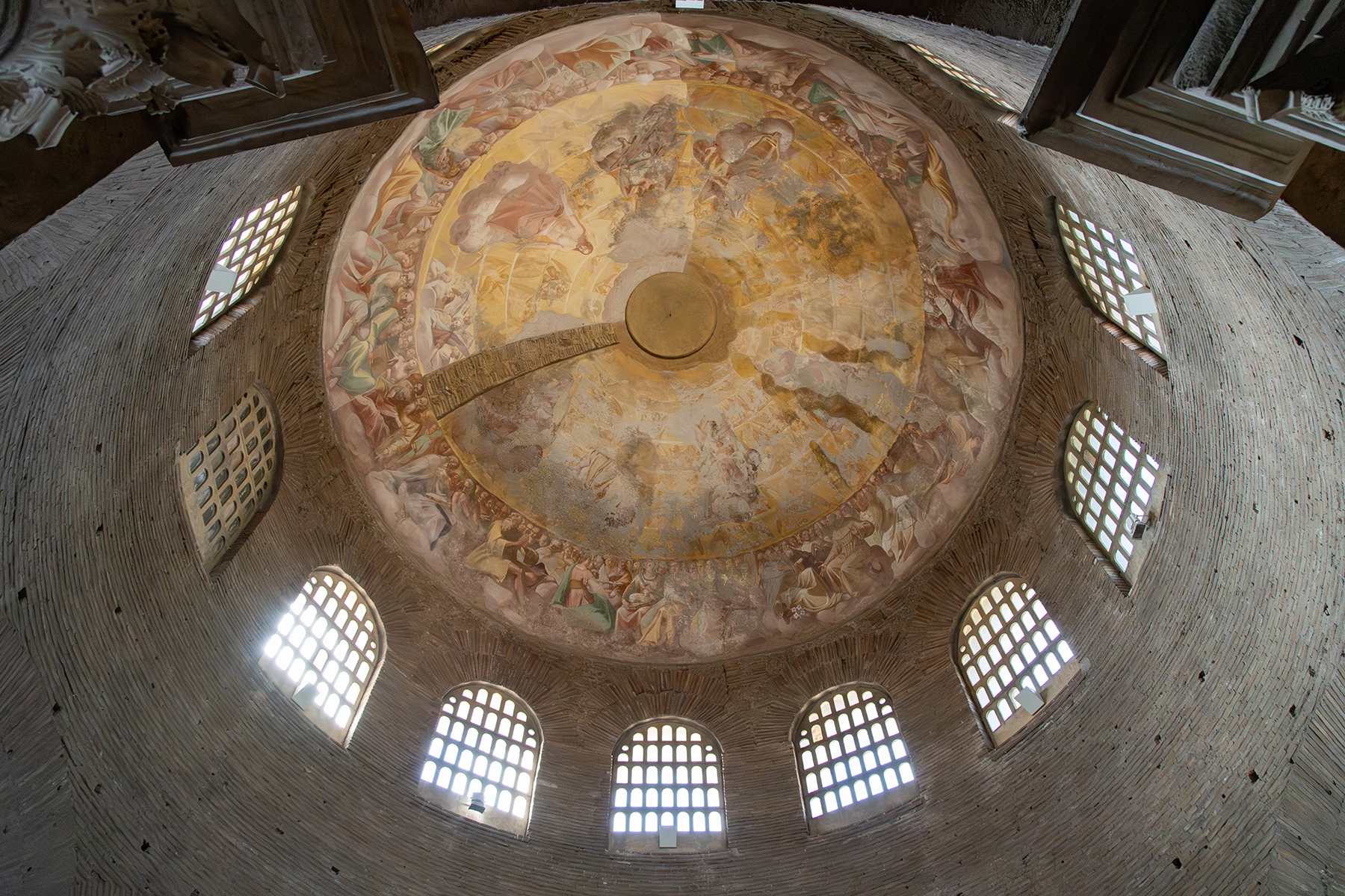 The central well of the church is surrounded by twelve columns (fig. 3). These column support the clerestory drum which is crowned by the central dome (fig.4) (3).The altar is centered in the brightly lit well below the dome, an excellent example of Schwarz’s model. As can be seen today by the arrangement of chairs, the congregation surrounds the altar for Mass just as Schwarz envisioned. (fig. 5)