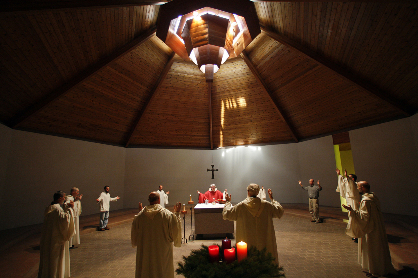 A modern example is that of the priory oratory at the Camoldolese hermitage in Big Sur, CA. This space reflects all of Schwarz’s principles just as its ancient predecessor (fig. 6) . The oratory forms the center of the entire complex of hermitages and monastic cells. The monastic austerity of the environment allows all attention to be focused on the altar, a symbol of Christ in the midst of his escatological family, and the liturgical action taking place upon it.