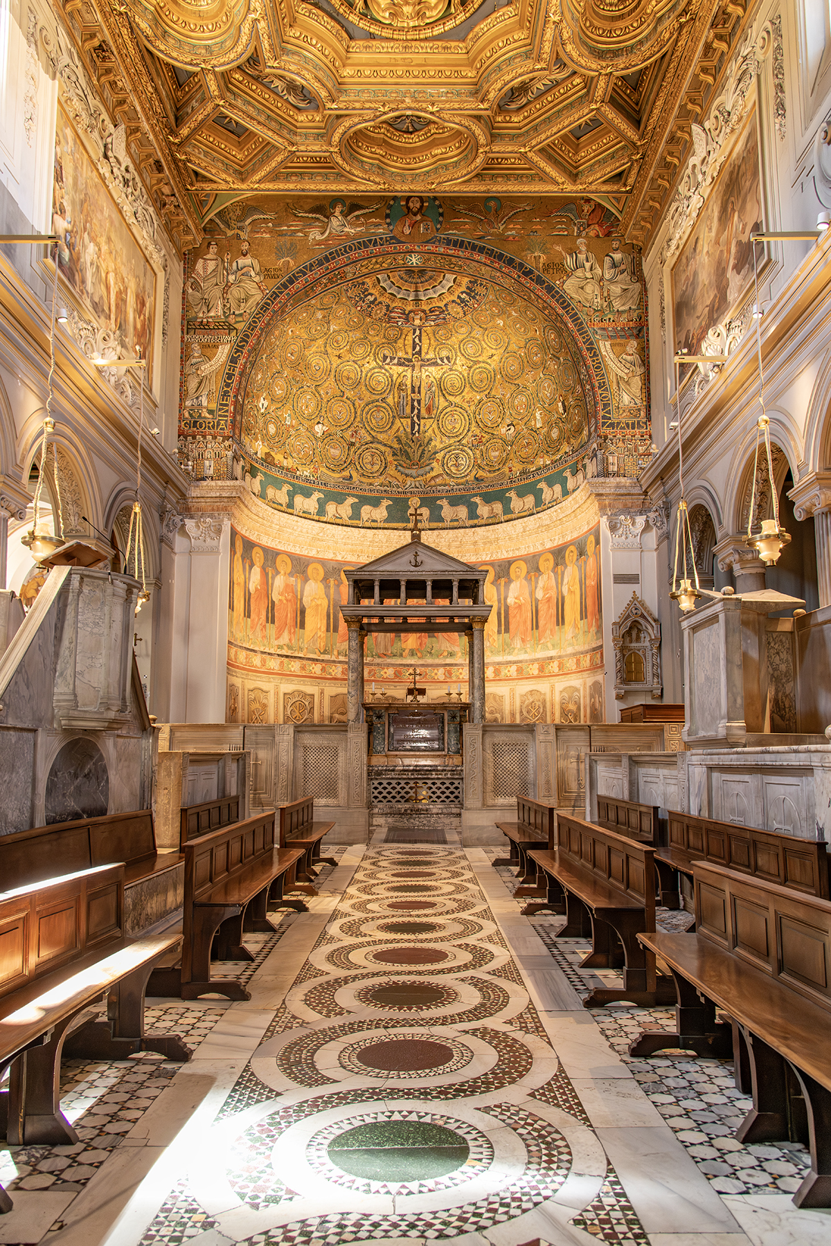 This classic model is well known in the longitudinal basilica and hall churches of history. During the Middle Ages this plan with various adaptations became an analogy for Christ crucified (his head the apse, transepts his arms and nave his body). A less static vision is seen in the photo of St. Paul Outside the Walls in Rome. Here, one enters the courts of Christ the true King who oversees his people in justice. The congregation must pass through a metaphorical triumphal arch, reflecting the victory over death won by the incarnation. It is no accident that the rondel of Christ the Pantocrator hovers over this arch, thus making all who pass through his victory a part of his body.