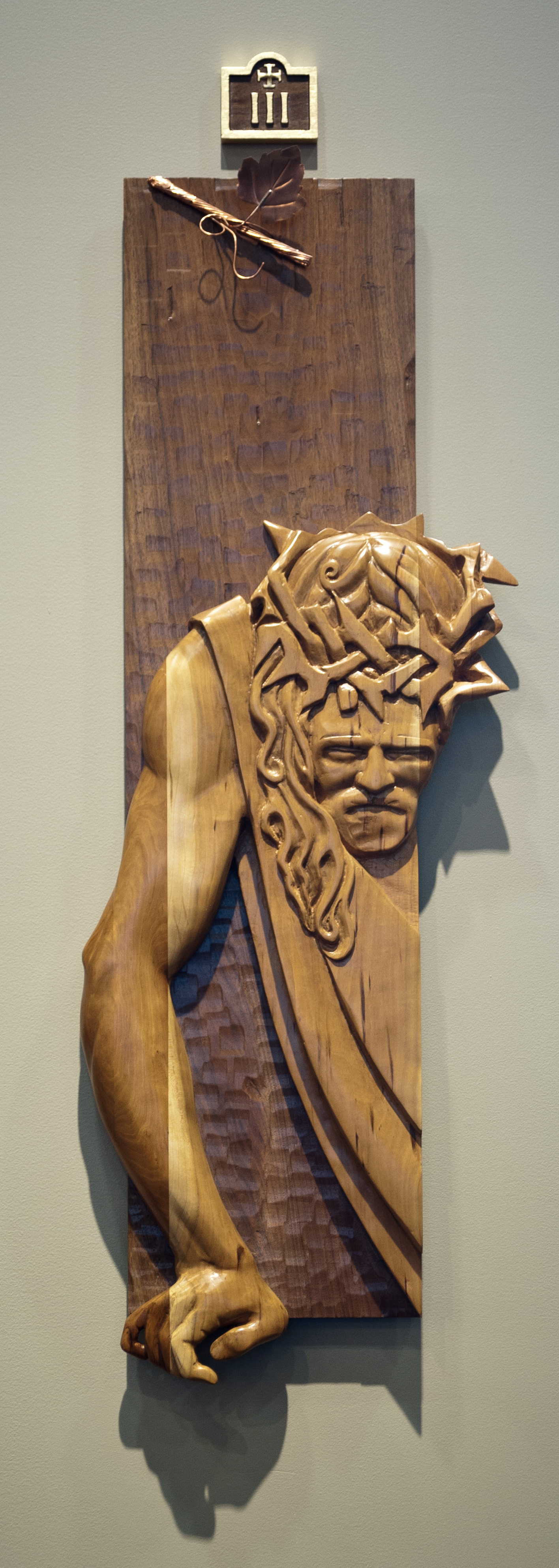 Station III: Jesus Falls the First TimeAlthough not directly mentioned in the Gospel, Jesus' fall is implied by His weakness and the need for Simon of Cyrene to assist with the carrying of the Cross.